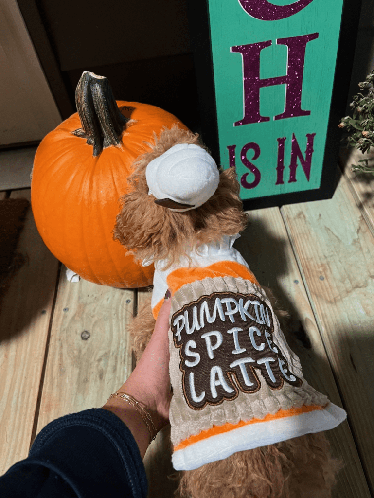 Lilli wearing a pumpkin spice latte costume. That’s my favorite holiday drink 😉